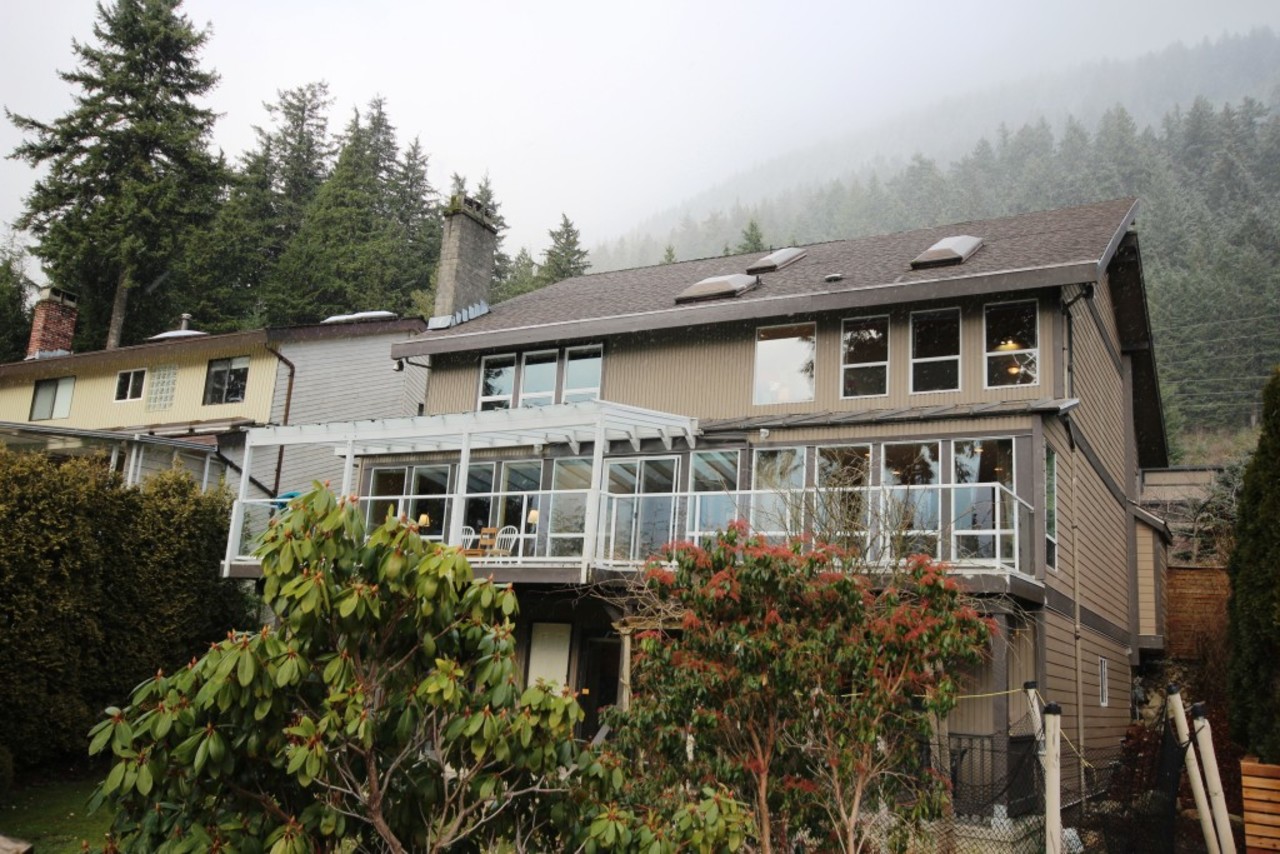 Love living in this 5900 SF home with WATER VIEWS through lovely pines perched high on a quiet cul-de-sac, this 3 level home offers a 2 bedroom spacious suite with deck area & access to the private back garden. Open plan main floor, offers a large family area, & grand sized living - dining area with many skylites & decks. Upper area has 5 bedrooms, 4 baths, & play craft room. This home is one of the few offering 7 bedrooms with a suite priced well below assessed value. Walk to Grouse mountain on private trail close by!