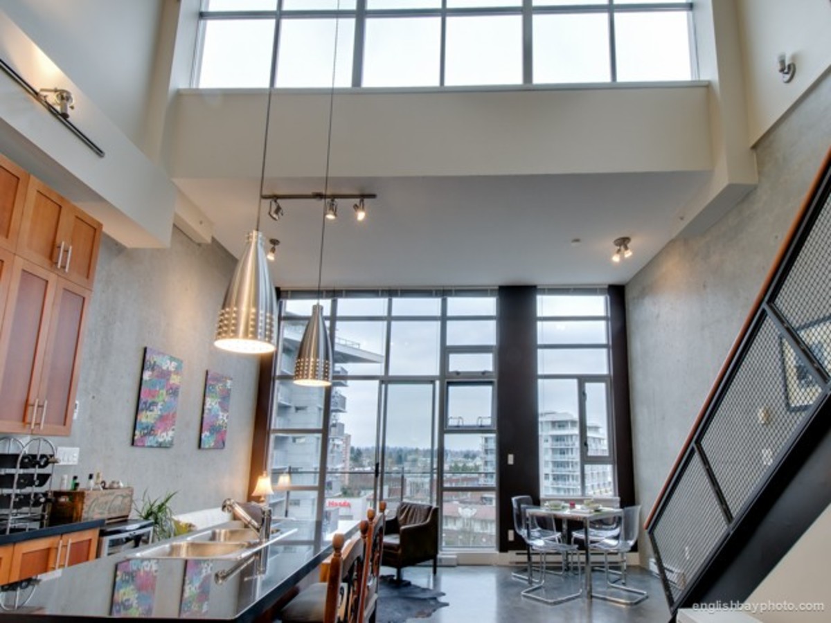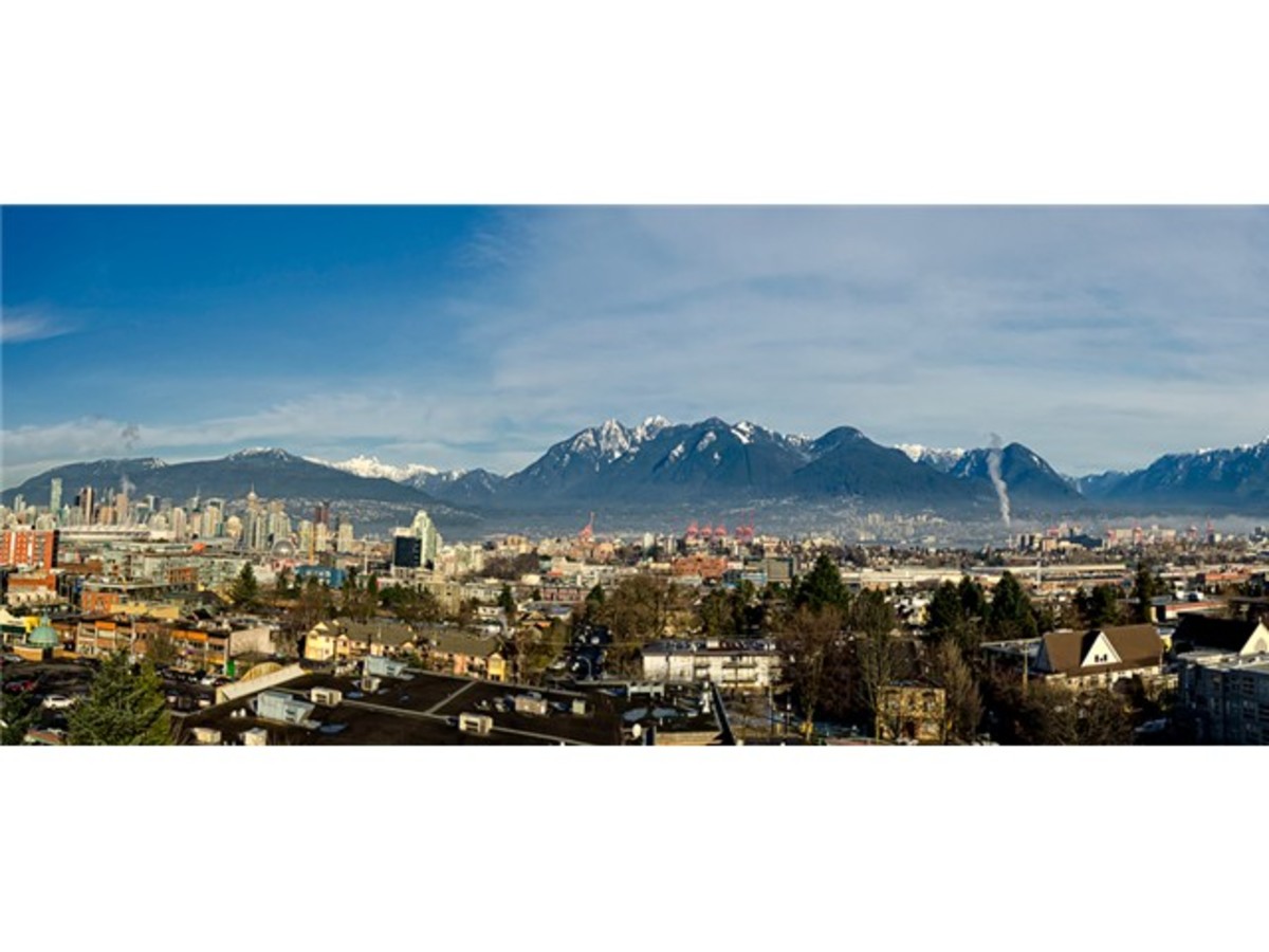 Top floor Penthouse loft with a massive 470 sqft private patio that over looks the entire City and North Shore Mountains with amazing sunsets all year long!The loft features 18' ceilings, upgraded kitchen cabinets with island and gas cooktop. This bright space has custom power blinds, and lots of insuite storage. Upstairs the master bedroom has custom closets and a full 2nd bathroom. Double doors open onto the patio. 2 secured parking spots. Great central location 1 block off Main Street
