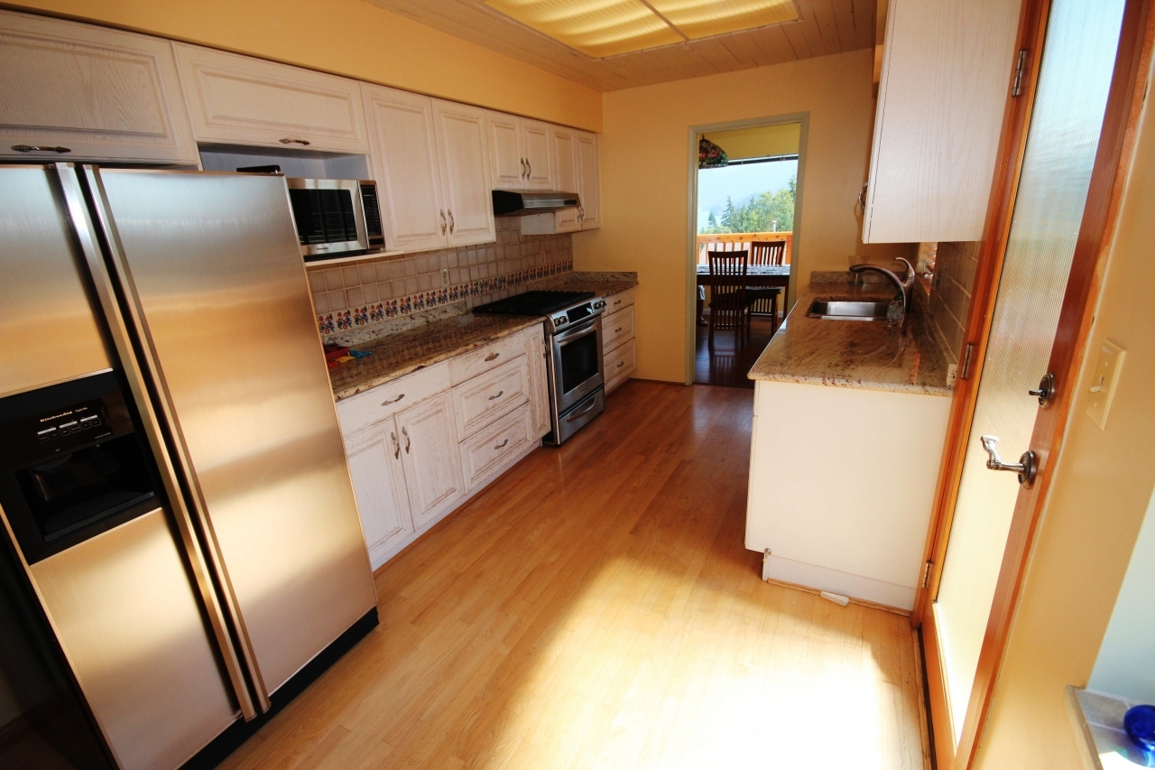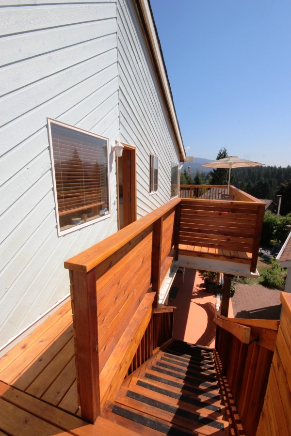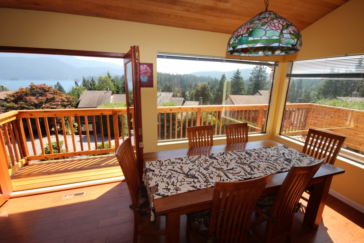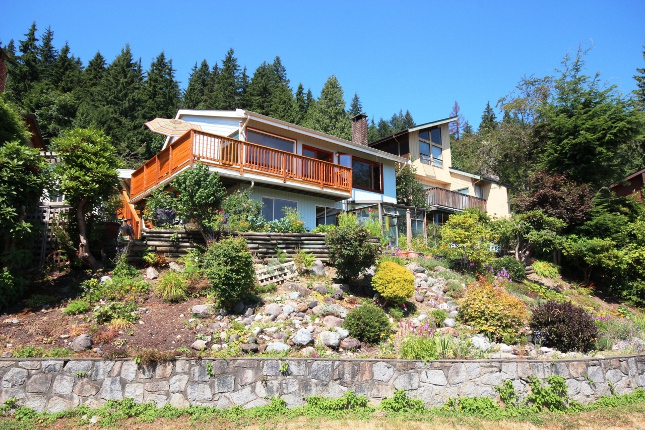 Imagine living here, with 180 degree ocean & mountain view - no power lines. This 2 level bright and airy modern home is in a peaceful location overlooking Deep Cove's beaches and shops, near forest trails - offered 1st time in 25 years!Newer cooks' kitchen with S/S appliances and granite counters.