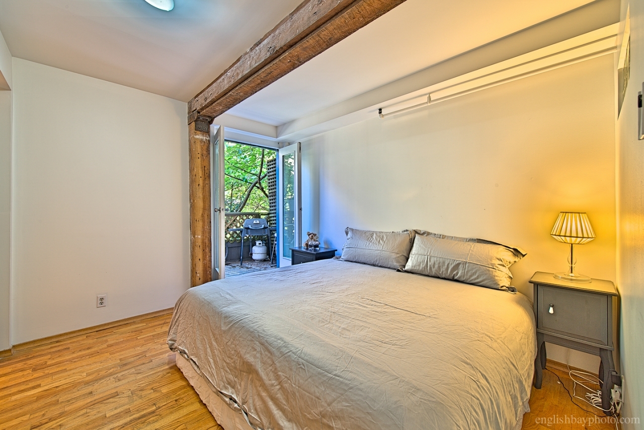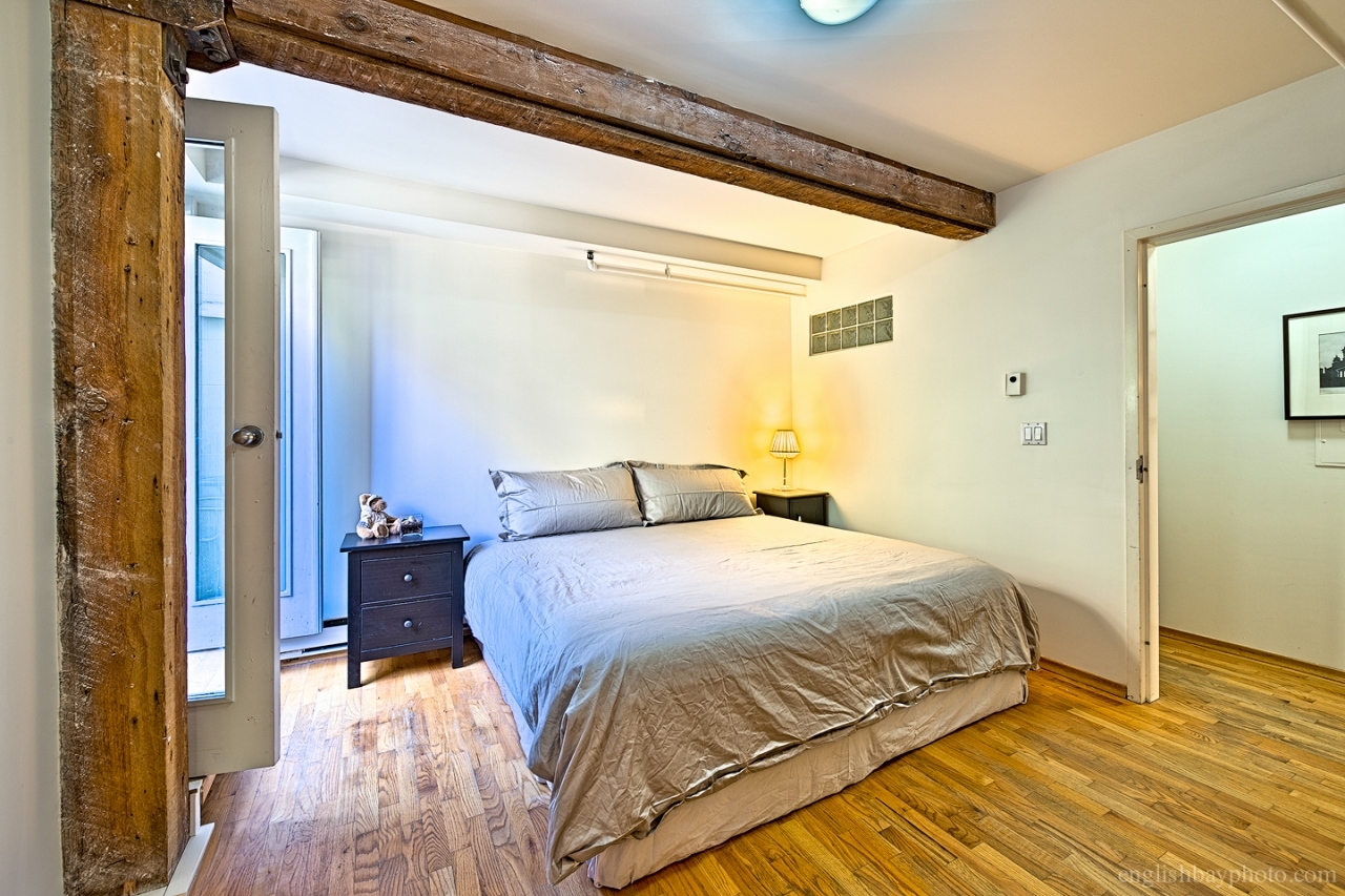 Mission House is an iconic 1312 heritage warehouse conversion. Don't miss seeing this oversized, bright, south facing 1 bedroom unit over 1000 sqf. Original exposed fir timber beams, brick wall, large windows with deep window sills and oak hardwood floors. Open concept kitchen, a spacious master bedroom with outdoor patio, bright bathroom & in suite full size laundry. Private storage locker on the same floor as suite. Building has upscale lobby, and rentals & pets are both allowed. A Gastown location on quiet street, steps to restaurants and shops, lots of available street parking out front, and a few blocks away from up and coming design district, Railtown.
