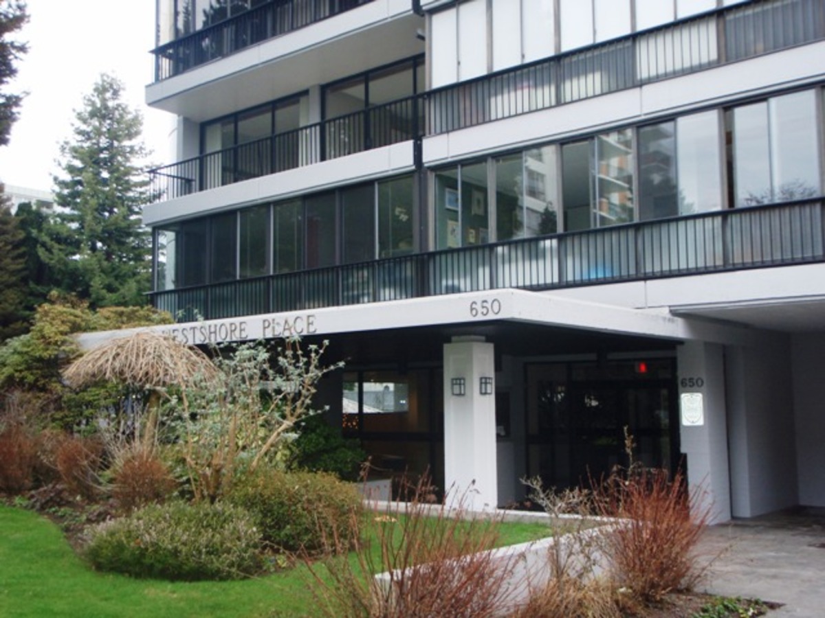 Great Ambleside corner apartment featuring 180 degree NW views. Enjoy the sunsets from the outdoor patio and soak in the sun. Lots of windows, a view that will not be blocked and great opportunity to create more of a open floor plan. The apartment building Westshore Place has been very well maintained and has a large South facing outdoor pool to enjoy in the Summer. 1 covered parking spot, and 1 storage locker. Pets allowed-but no rentals.