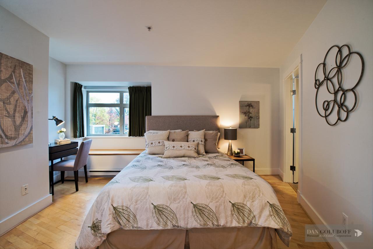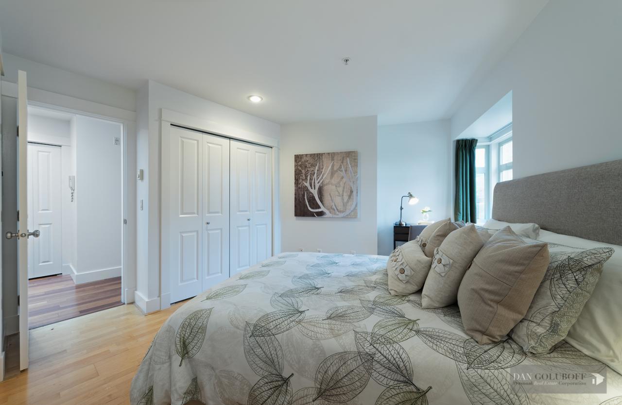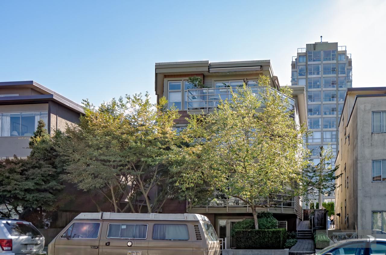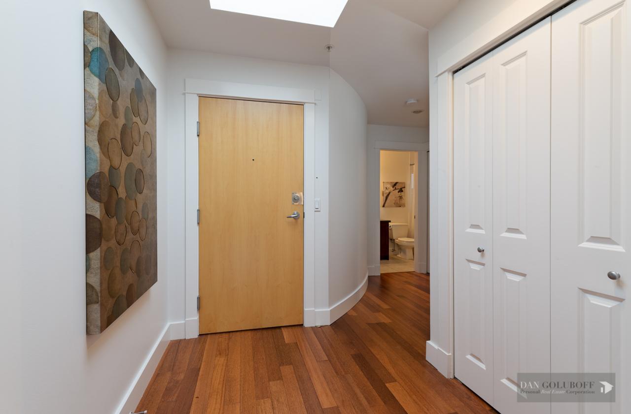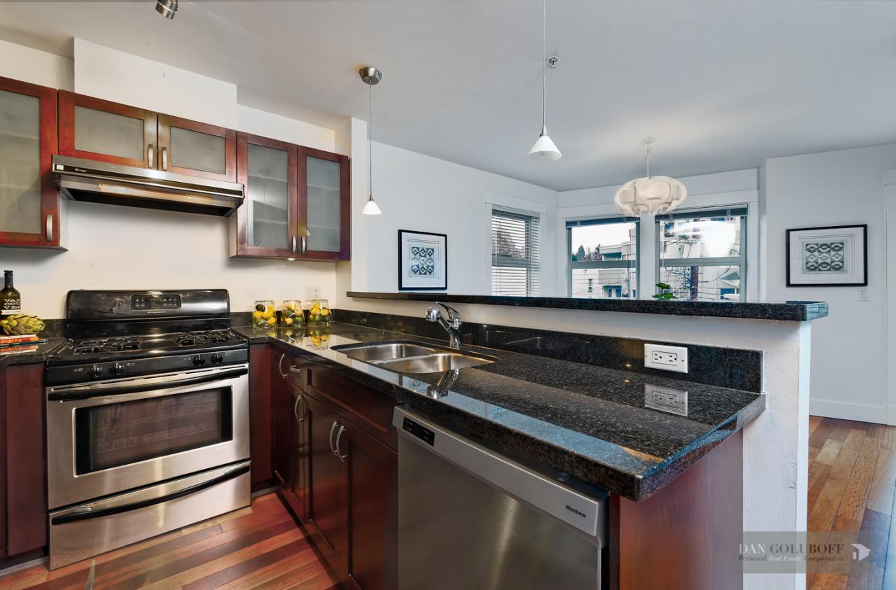 Luxurious 2 bdrm/2 bath top floor S. facing corner unit with a wraparound deck off the Livingroom offers lots of natural light. The apartment is in spotless condition with upgraded hardwood floors & freshly painted. Features include top of the line stainless steel appliances, open kitchen concept with granite counters & gas cooktop, large skylight above the entry foyer, walk in mbdrm closet, gas fireplace. This boutique 8 unit building called Torrey Pines won the Georgie Award when first built and has only 2 units per floor. The complex has been meticulously maintained & features beautiful landscaped grounds. Ideally located in the heart of South Granville just a 1/2 block from fantastic shopping & restaurants. 2 secured side by side parking spots & 1 locker are included.