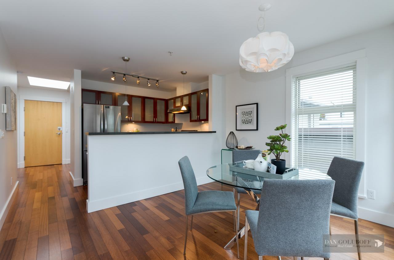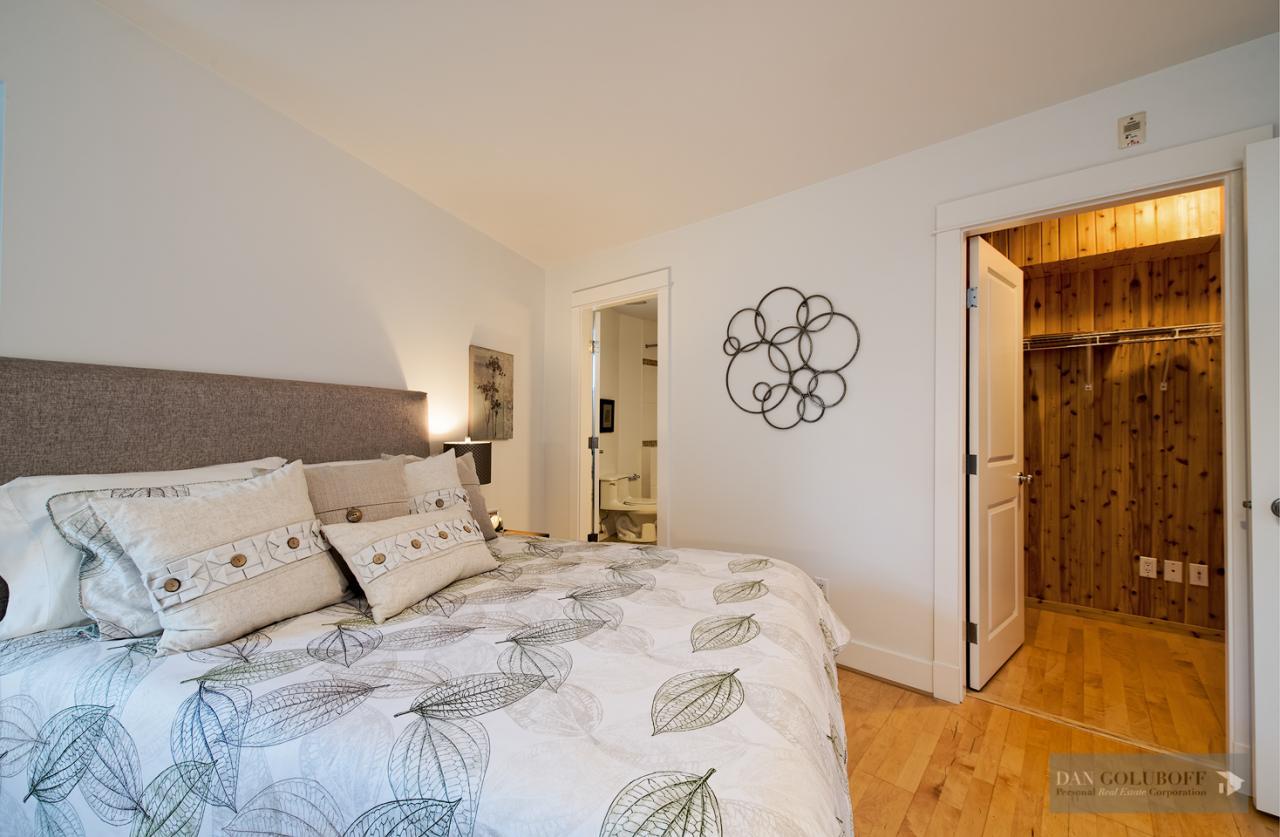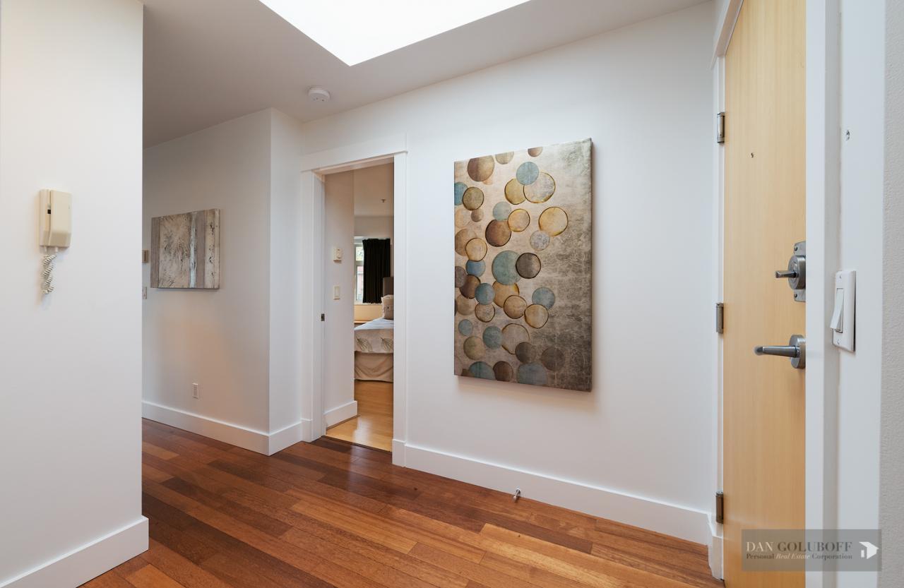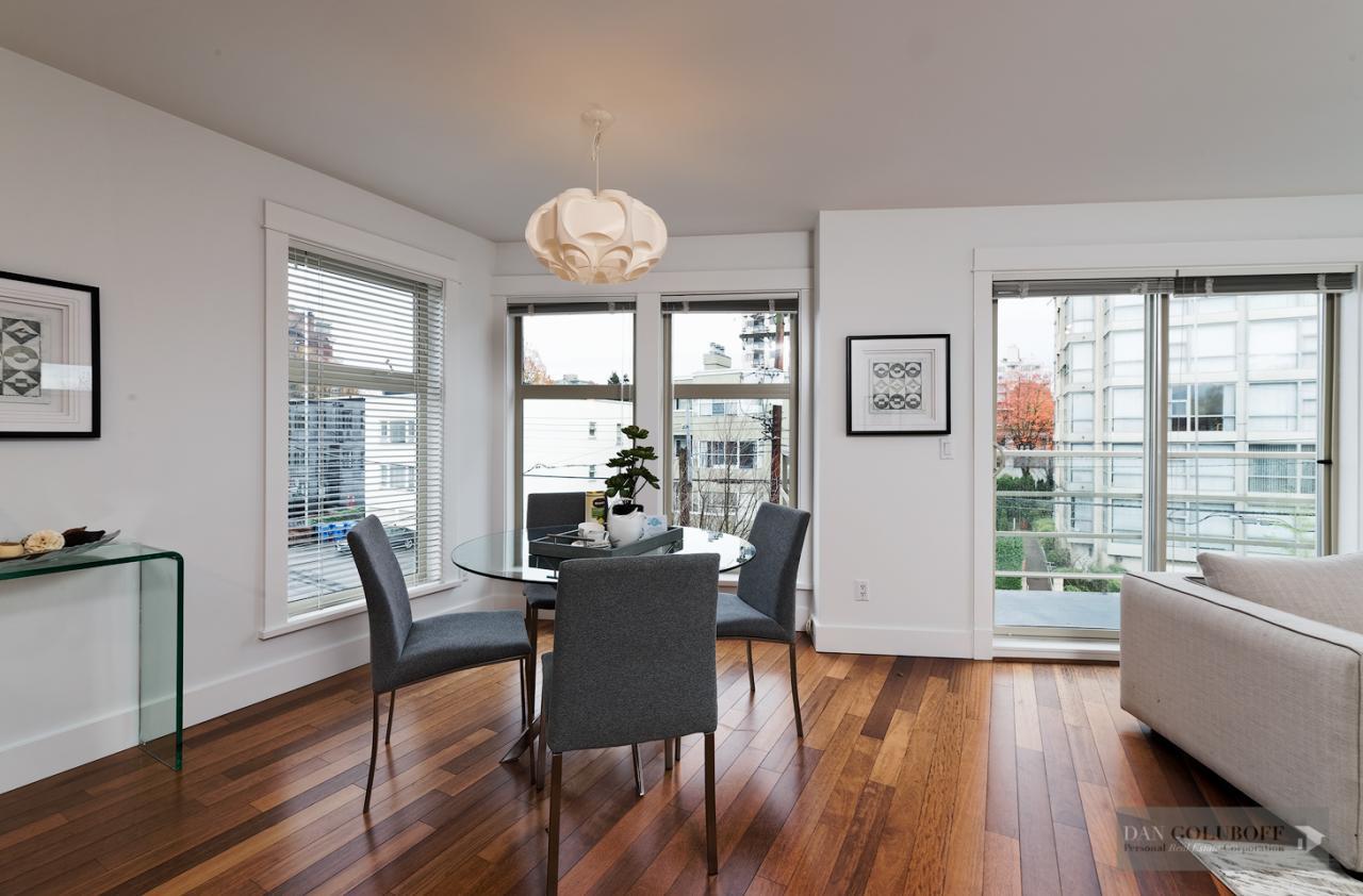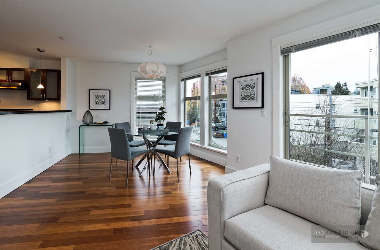 Luxurious 2 bdrm/2 bath top floor S. facing corner unit with a wraparound deck off the Livingroom offers lots of natural light. The apartment is in spotless condition with upgraded hardwood floors & freshly painted. Features include top of the line stainless steel appliances, open kitchen concept with granite counters & gas cooktop, large skylight above the entry foyer, walk in mbdrm closet, gas fireplace. This boutique 8 unit building called Torrey Pines won the Georgie Award when first built and has only 2 units per floor. The complex has been meticulously maintained & features beautiful landscaped grounds. Ideally located in the heart of South Granville just a 1/2 block from fantastic shopping & restaurants. 2 secured side by side parking spots & 1 locker are included.