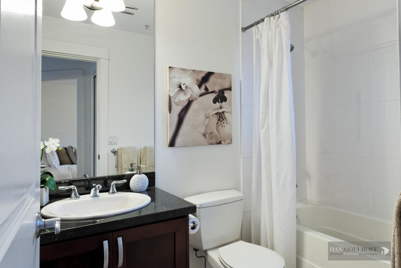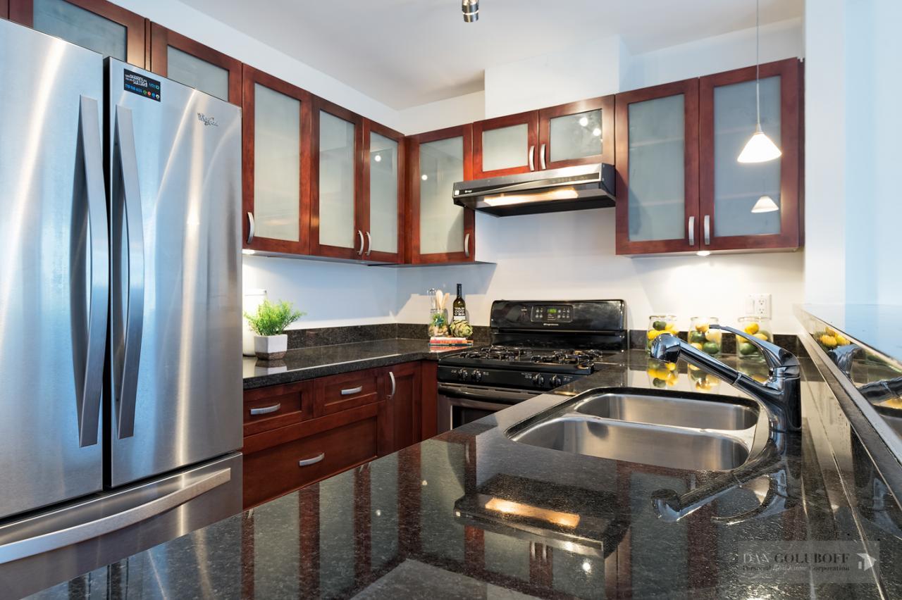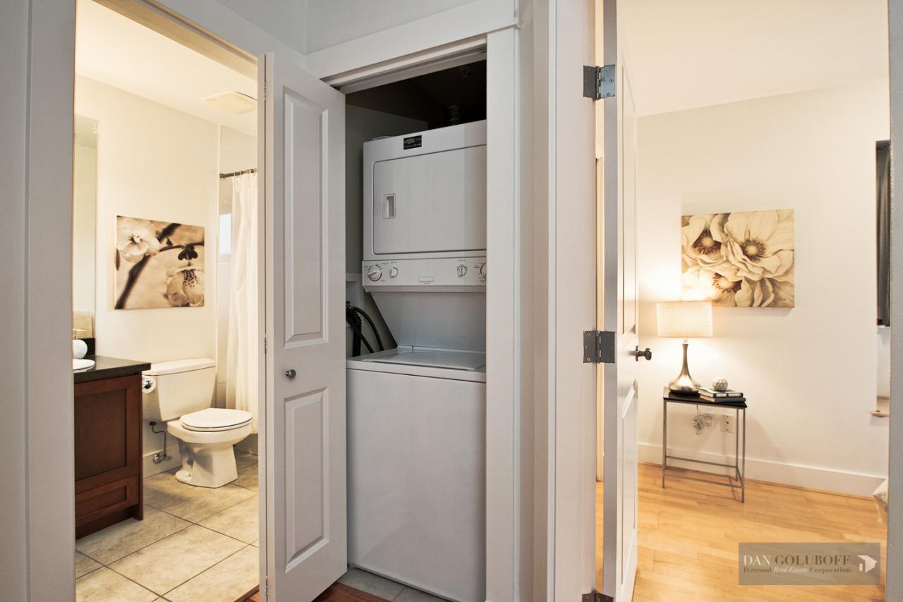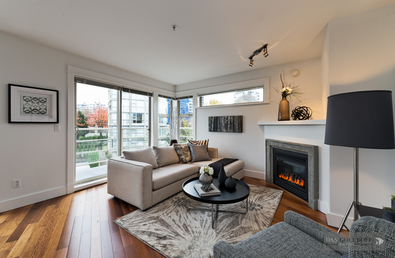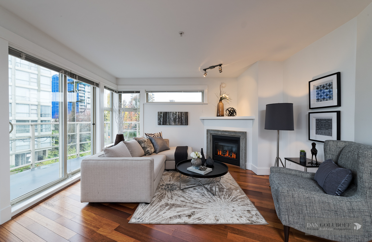 Luxurious 2 bdrm/2 bath top floor S. facing corner unit with a wraparound deck off the Livingroom offers lots of natural light. The apartment is in spotless condition with upgraded hardwood floors & freshly painted. Features include top of the line stainless steel appliances, open kitchen concept with granite counters & gas cooktop, large skylight above the entry foyer, walk in mbdrm closet, gas fireplace. This boutique 8 unit building called Torrey Pines won the Georgie Award when first built and has only 2 units per floor. The complex has been meticulously maintained & features beautiful landscaped grounds. Ideally located in the heart of South Granville just a 1/2 block from fantastic shopping & restaurants. 2 secured side by side parking spots & 1 locker are included.