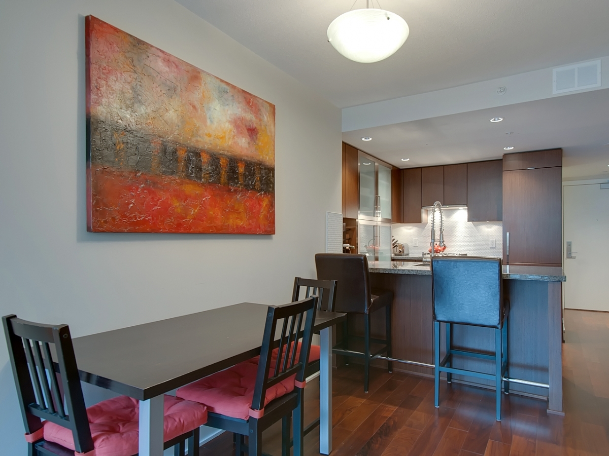 Live at the DONOVAN!-A Georgie award winning building by Cressey in the heart of Yaletown, just one block away from the new Emery Barnes Park. Enjoy a polished and immaculate 1 bdrm & den and nearly 250 sq. ft of a landscaped, west facing, private patio above a quiet lane. Smartly designed kitchen w/Miele appliances, gas range, granite countertops, stunning backsplash & pantry. Open floor plan with wide-plank h/w floors, comtemporary finishings, custom built in closet, in suite storage, geothermal htg&AC, and in suite laundry. This new building has fantastic amenities featuring a gym, yoga center, sauna/steam rm, deluxe entertainment lounge & rooftop terrace. 1 secured prkg & large stg locker & balance of 2-10-10 warranty.