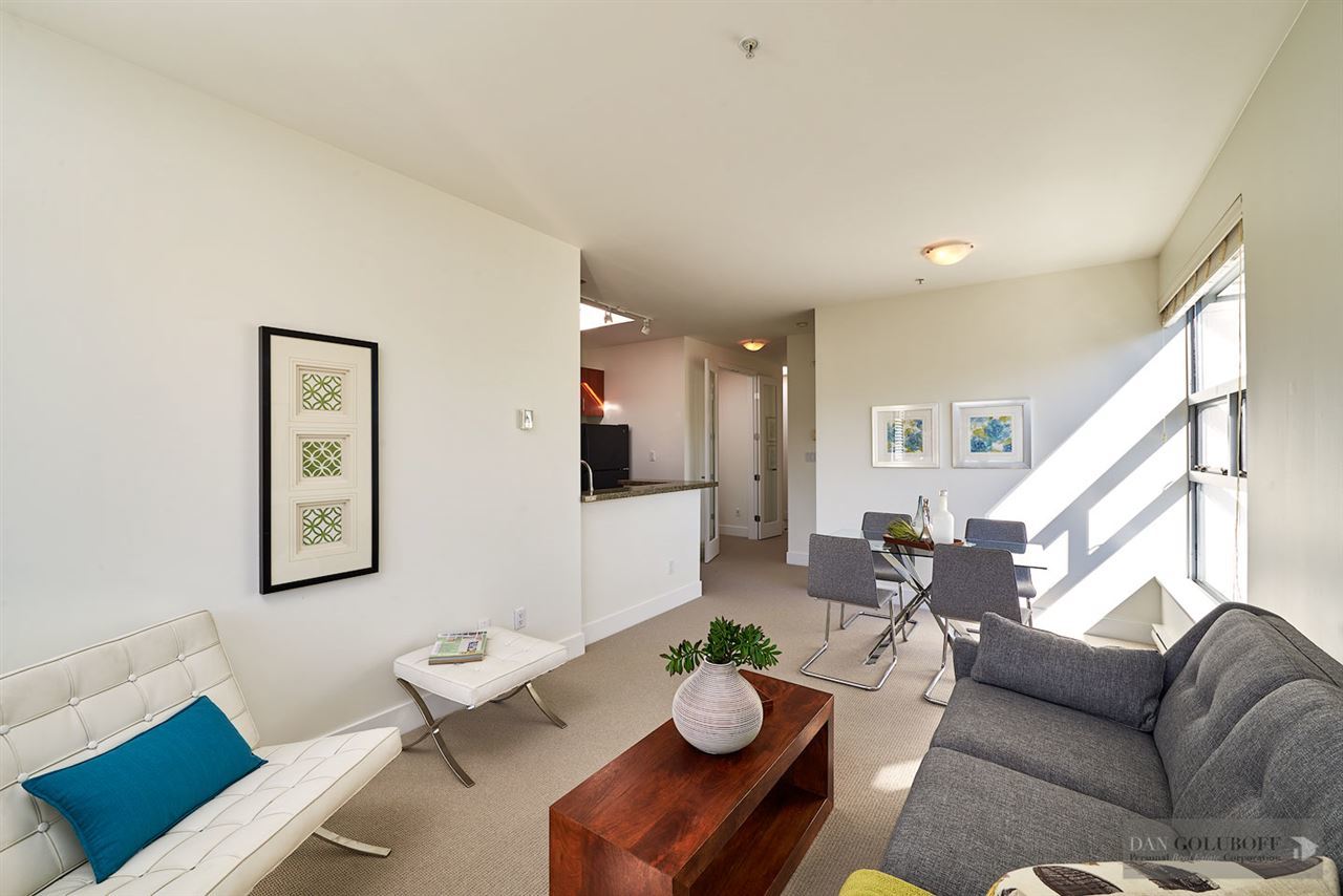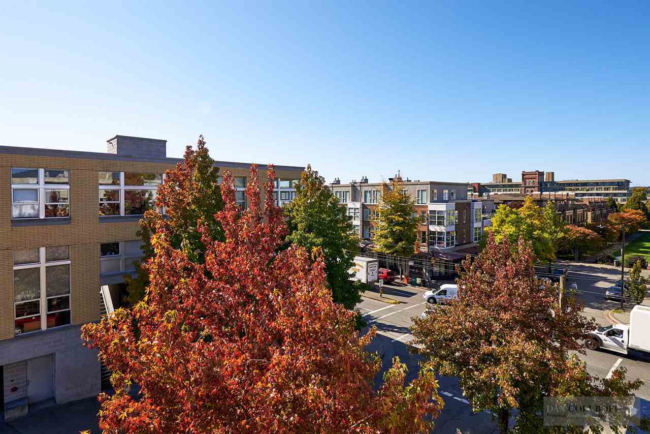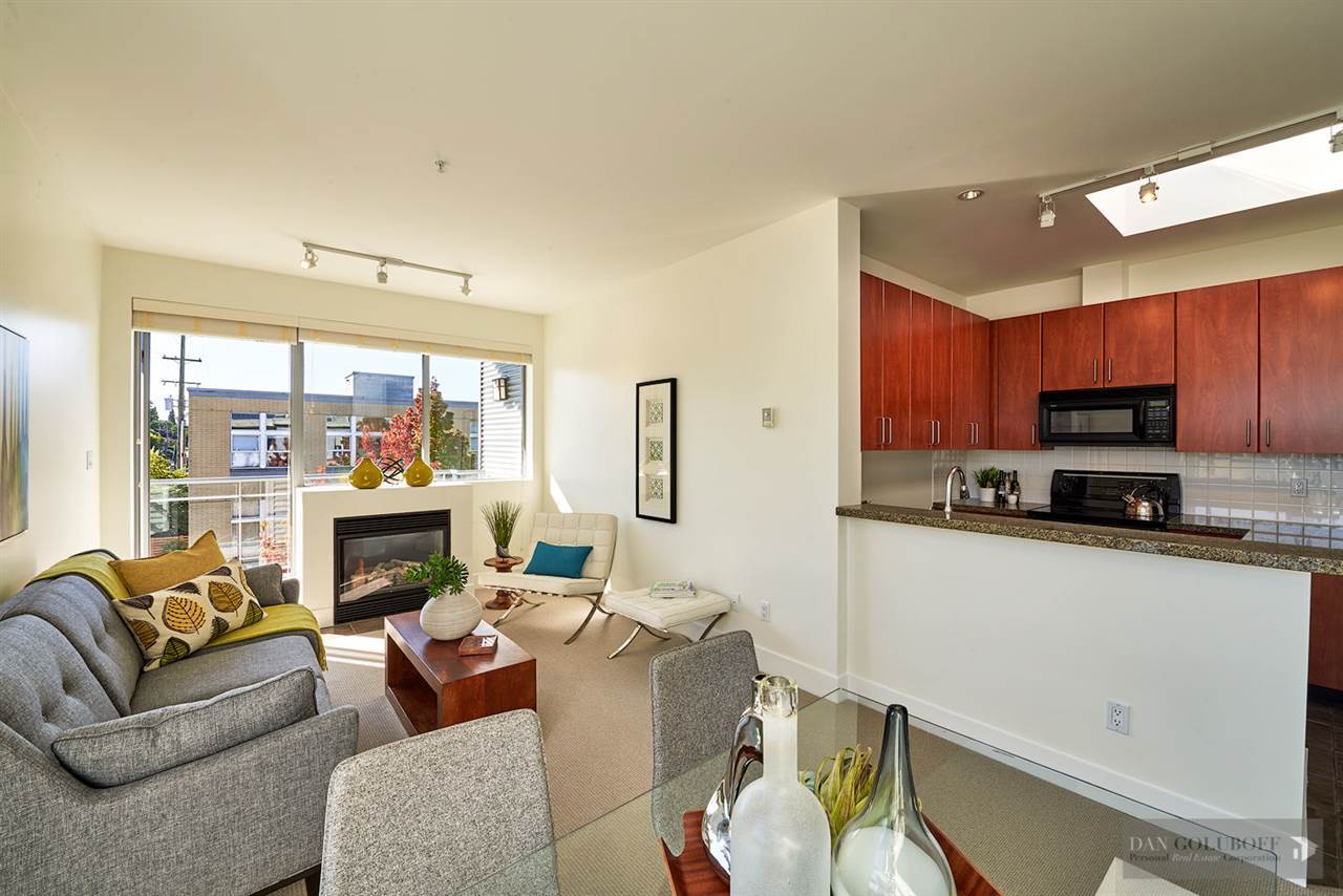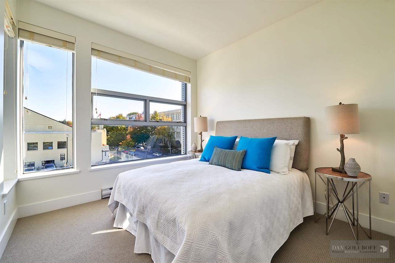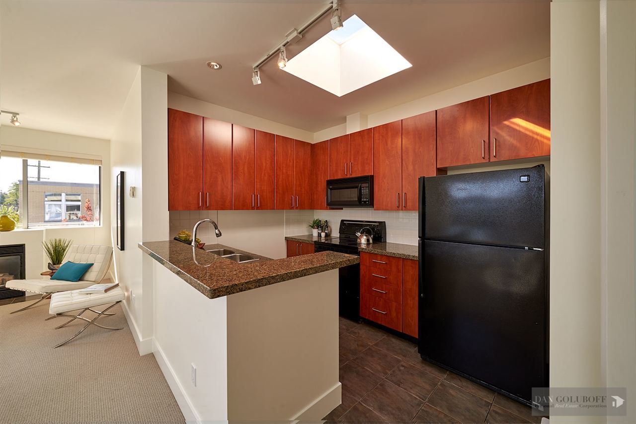 Stunning top floor 2 bdrm, 2 bath and den corner unit with South facing outdoor patio and two skylights. This bright concrete built apartment features granite counters, gas fireplace, new wool carpet and freshly painted. Open concept with over height ceilings, heated bathroom floor in master bedroom and built in closet cabinets. Located on the quiet side of the building. 1 parking, in suite laundry and in suite storage and common bike room. Centrally located in one of Kitsilano's most sought after neighbourhoods, walking distance to shops, restaurants, parks and Kits Beach.