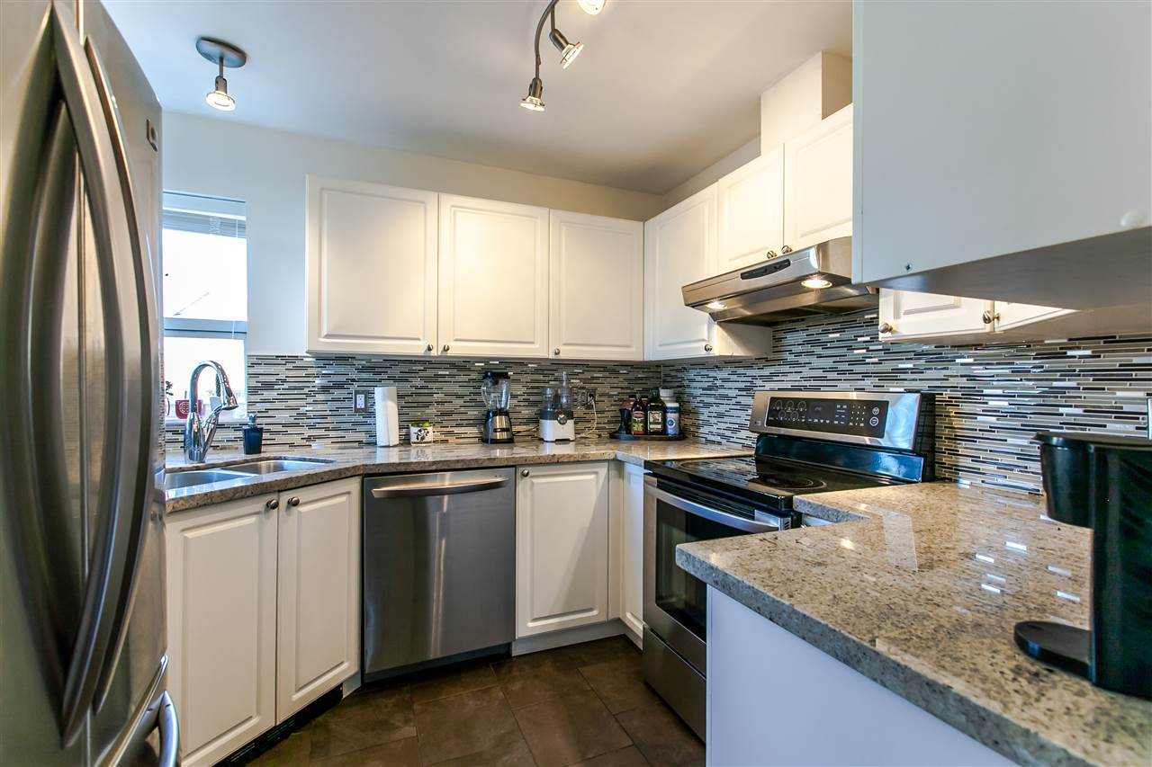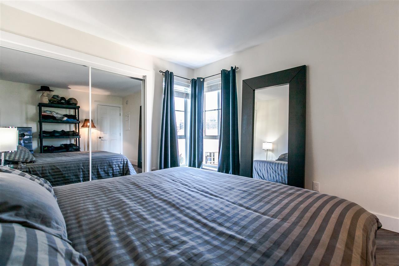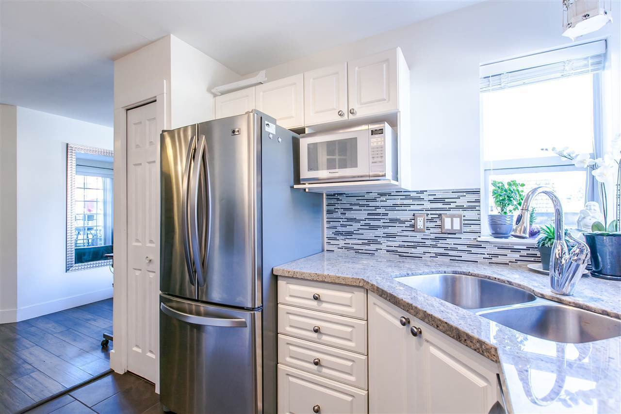 Top floor, one bedroom corner unit in impeccable condition. The large 110sqft NW facing patio gets great sun exposure. Condo features include vaulted ceilings, gas fireplace, insuite laundry, bright and private, french doors open onto patio. The updated kitchen has granite counters, stainless steel appliances, and a bright picture window above the sink. Located on a beautiful tree-lined, quiet street blocks from Lonsdale Quay. Building excellently maintained by proactive strata: plumbing upgrades in 2011-13, new roof 2007, elevator upgrade 2017. 1 storage locket and 1 parking stall. Visitor parking available. The ideal location is minutes from shopping, restaurants, and transit. Rentals allowed with restrictions and pets welcome with restrictions.