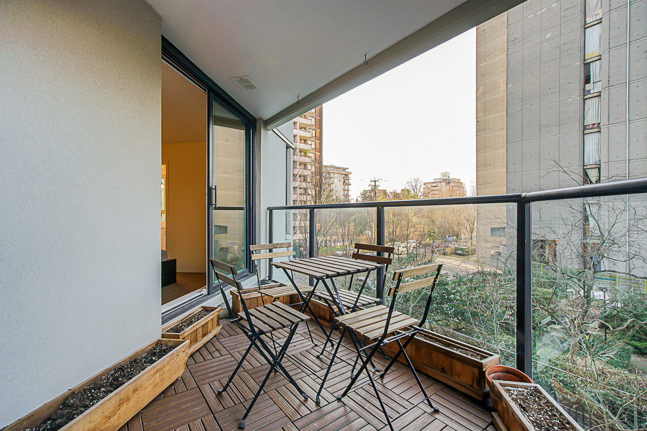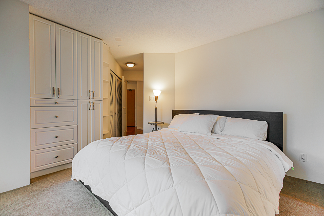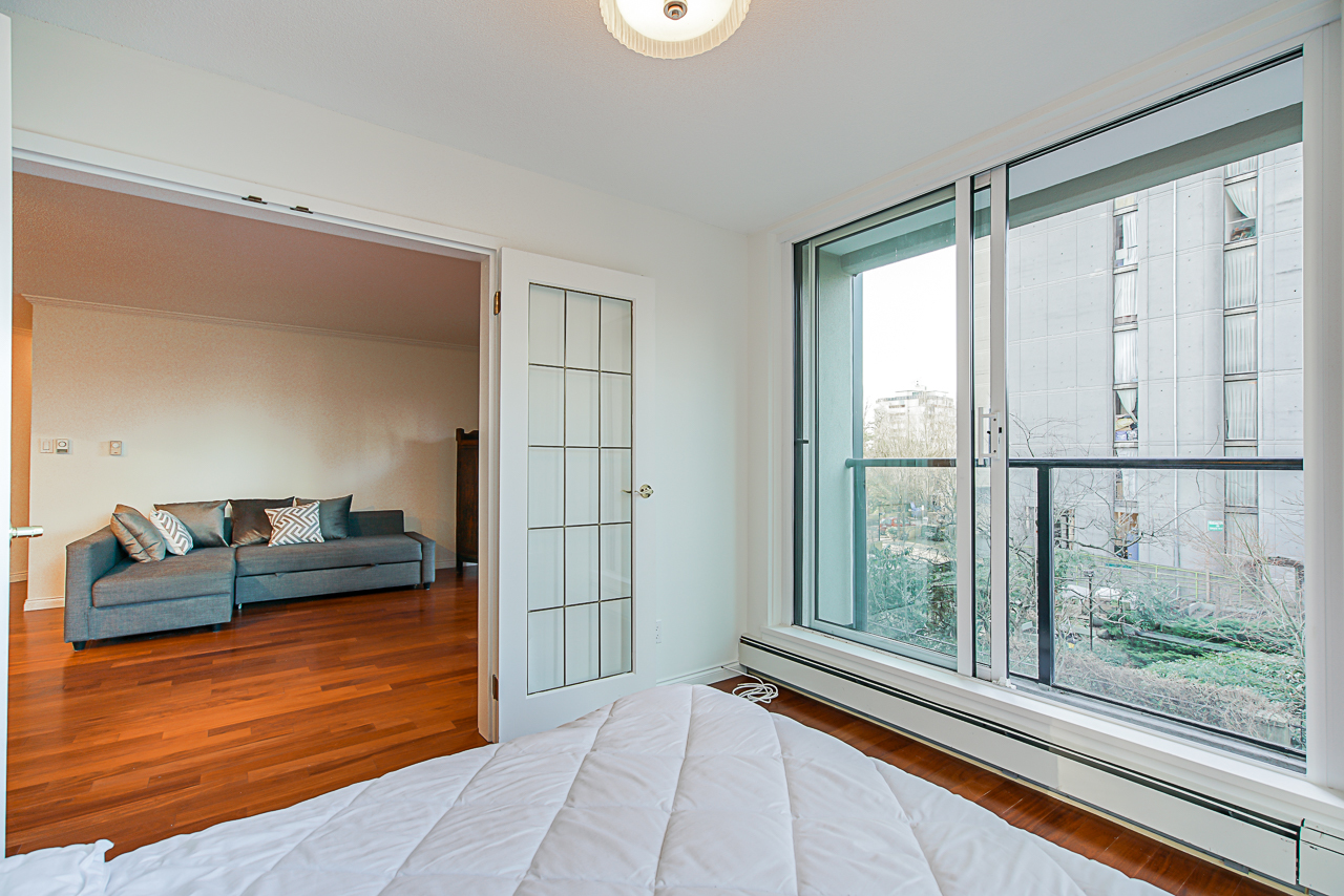 Spacious 2 bdrm, 2 bathroom NW corner suite in prime West End/Downtown location. Steps from English Bay. Over 1,000 sqft. with large outdoor balcony that overlooks the garden courtyard-quiet side of the building. Beautiful natural light throughout, hardwood floors, generous living room, kitchen with stainless steel appliances, a master bedroom that fits a king sized bed with ensuite & soaker tub. Radiant H/W heat, 2nd bdrm has a built in murphy bed & side cabinet with juliette balcony. In suite laundry & storage room. 1 parking spot. Great amenities: Visitor parking, Outdoor pool, gym, hot tub, common rooms pool table, piano & a Guest suite. The Ellington is impeccably maintained building- new exterior completed in 2017. Dogs & cats allowed, 10 rentals allowed(currently a waitlist)