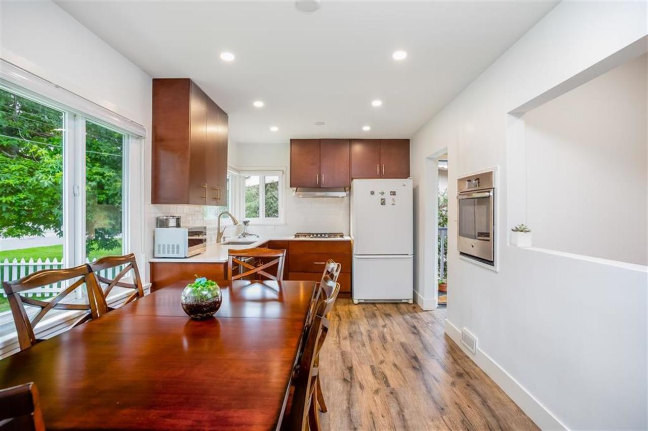 This bright two-level bungalow is situated on a sunny south facing lot with lane access. It was professionally renovated in 2019. The updates include a modern kitchen with quartz counter tops and SS appliances which includes a gas stove, updated baths, light fixtures, flooring, windows, plumbing, electrical and more. This home features 4 bedrooms, 3 bathrooms and a fully finished basement. There is loads of storage within the home as well as a freestanding double garage with heat, power and a loft. It’s located at a fantastic central location just steps away from the newly restored Ridgeway elementary and one block away from the North Vancouver "Green Necklace" urban walking trail. You will love this house if you’re looking for a cheerful suburban home! RS-1 zoning w/coach house potential.