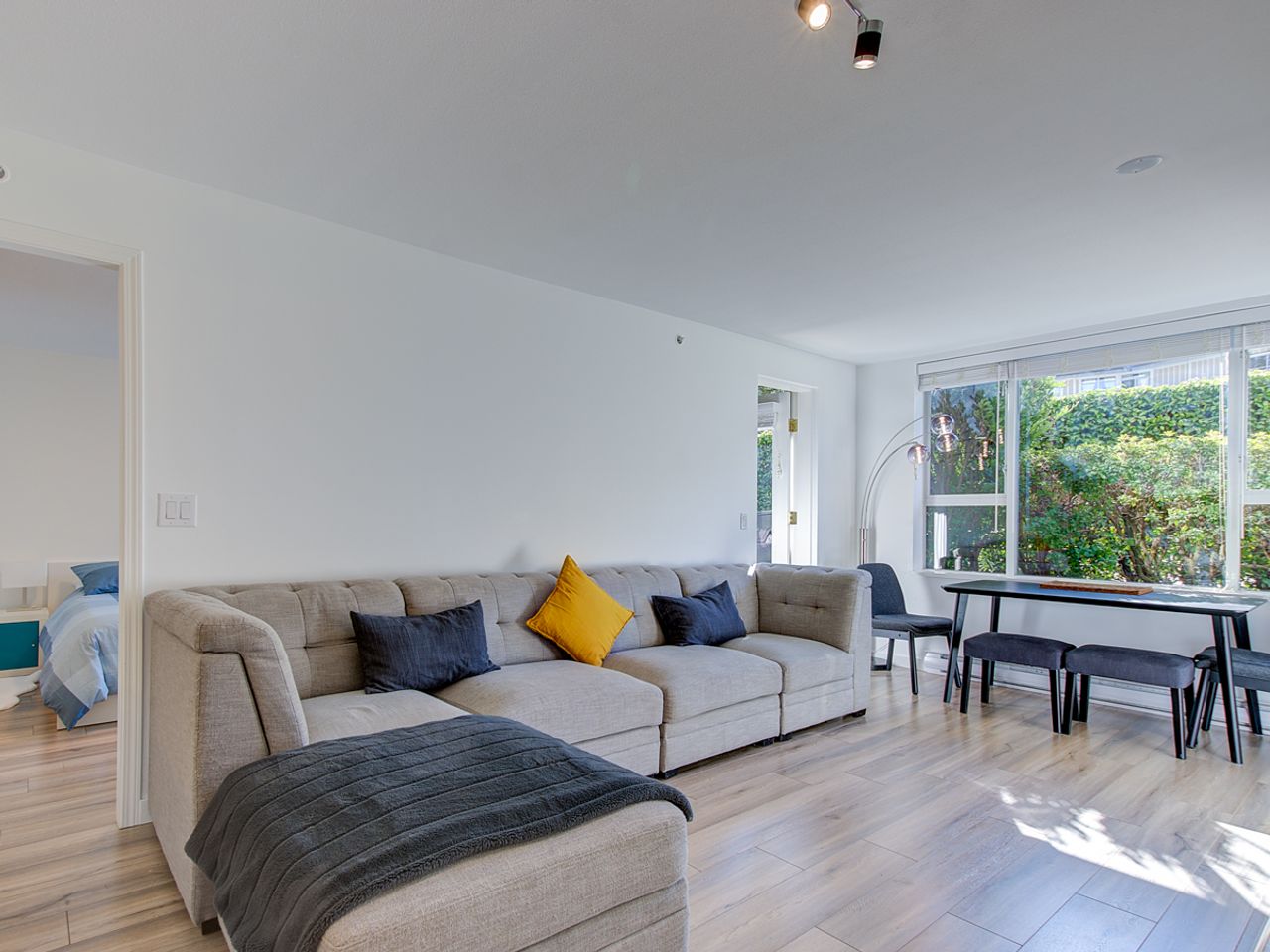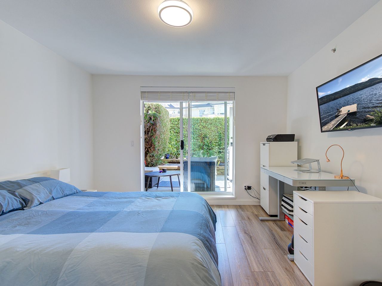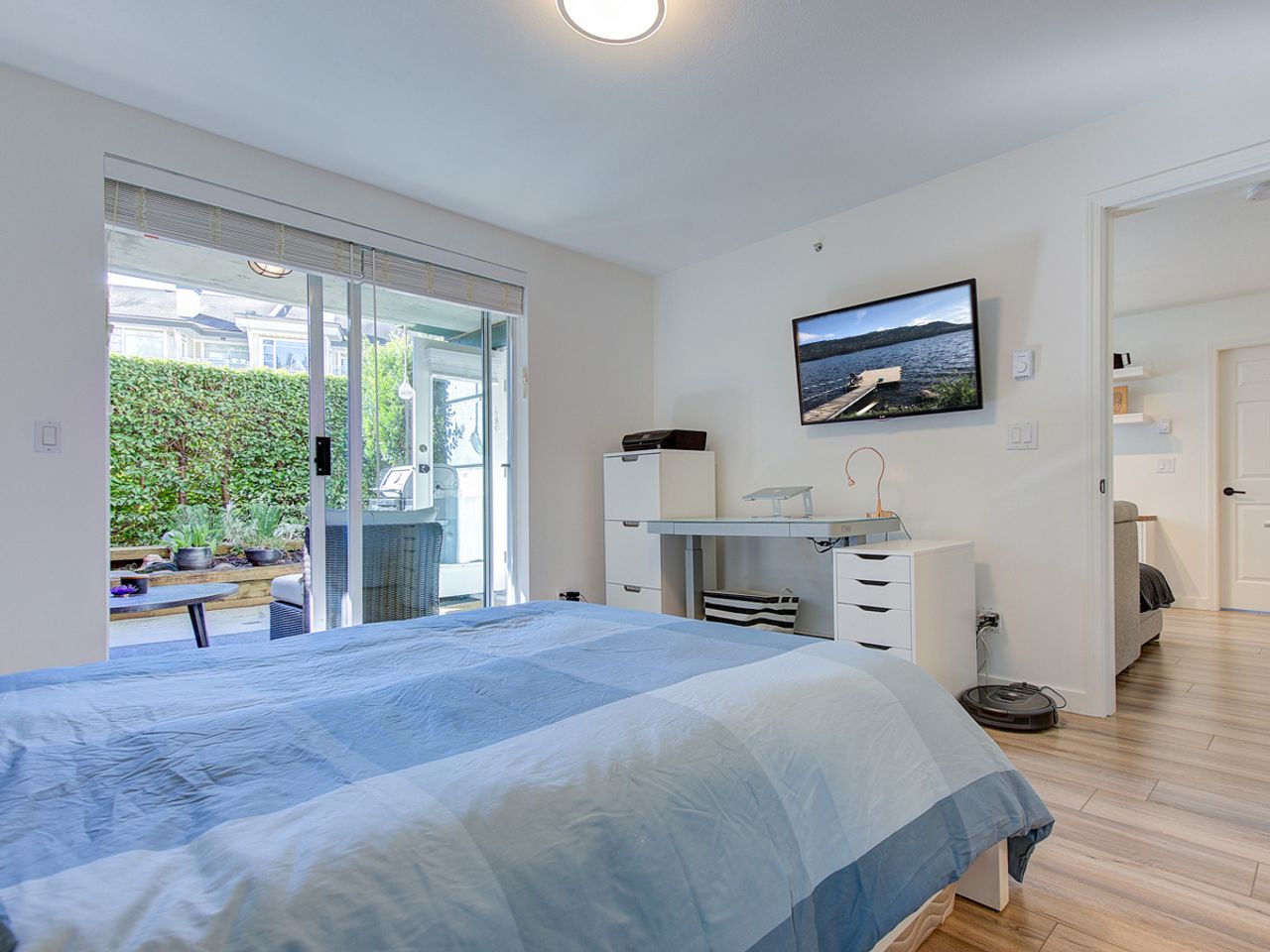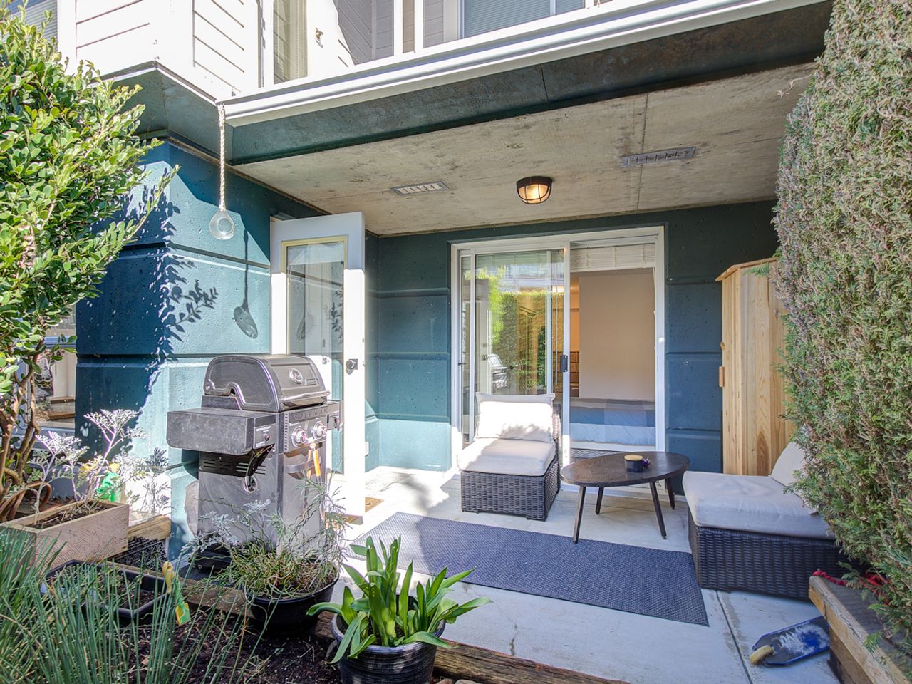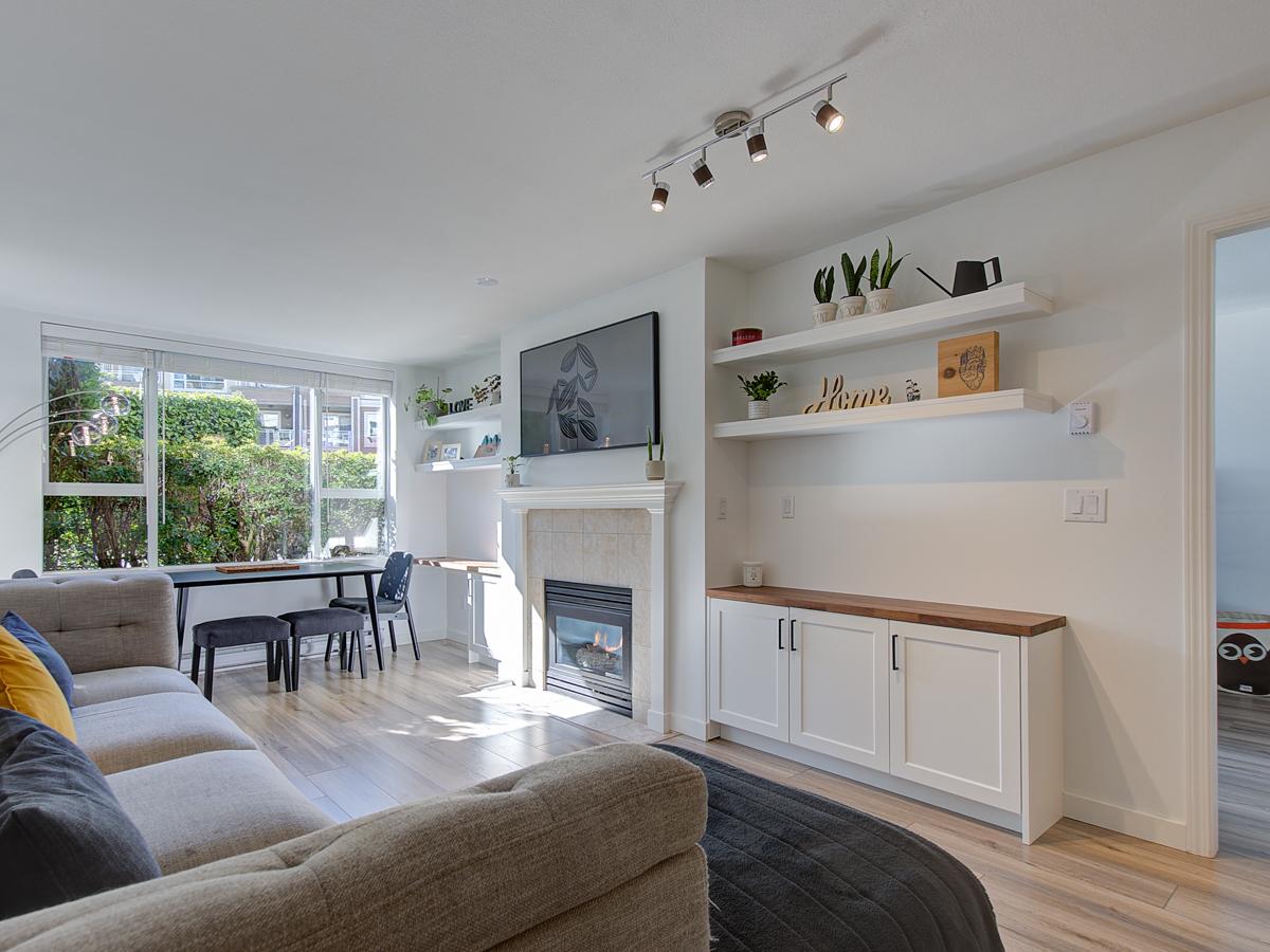 MUST SEE: Beautifully updated 2 bdrm 2 bath garden suite w private south facing covered patio. This home checks all the boxes: smart open concept layout, modern kitchen with brand new appliances, bright dining and living rooms, a gas fireplace and custom cabinetry/built in closets. Immaculate condition, sparkling clean with strong pride of ownership. Suite has easy access to property's surrounding gardens and sidewalks. Comes with 1 parking and 1 storage locker on the same level as unit. Building's ground and 1st floor is concrete construction soundproofing unit. Amenities include a large gym and clubhouse, rentals and pets both allowed. Ravenwoods is a wellknown community loved by residents that's minutes to Deep Cove, the shore's best mountain trails, golf courses and local ski hills. Showings by appointment between Tuesday March 23rd 4 to 6pm, Thursday March 25th 4 to 6pm, Saturday 11 to 1:30pm.